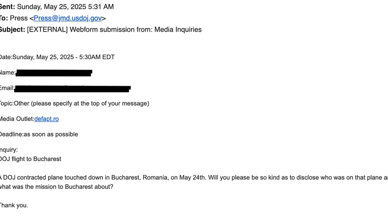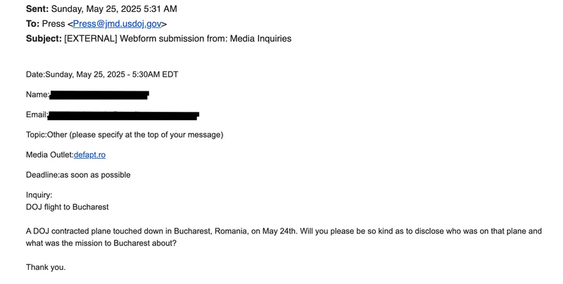 DeFapt.ro a trimis o solicitare oficială de informații Departamentului de Justiție (DOJ) al SUA în legătură cu avionul care a aterizat la București.