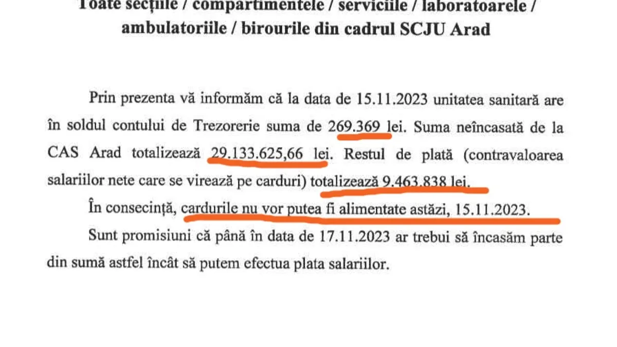 „Sunt promisiuni că până la data de 17.11.2023 ar trebui să încasăm parte din sumă astfel încât să putem efectua plata salariilor”, se arăta în mesajul conducerii spitalului către angajați.