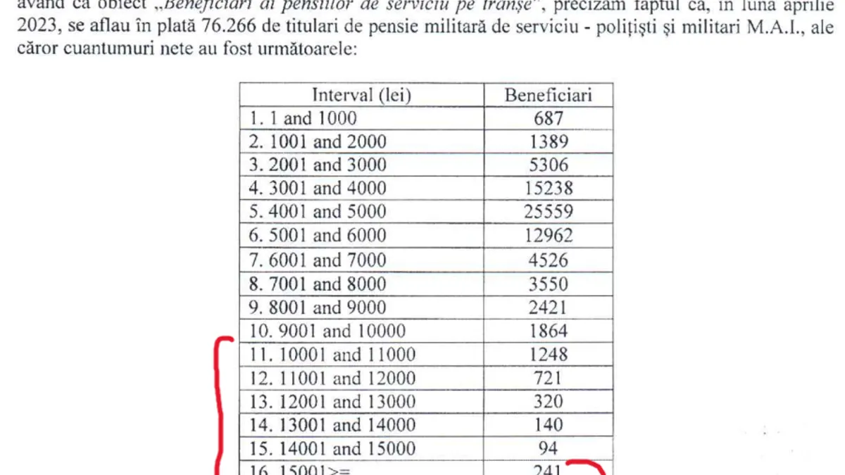 Numărul pensionarilor speciali din Interne care primesc peste 10.000 lei/lună
