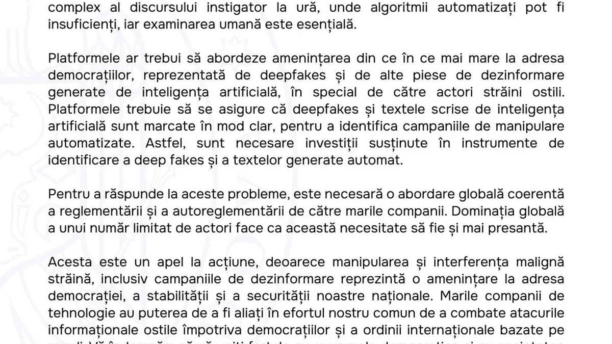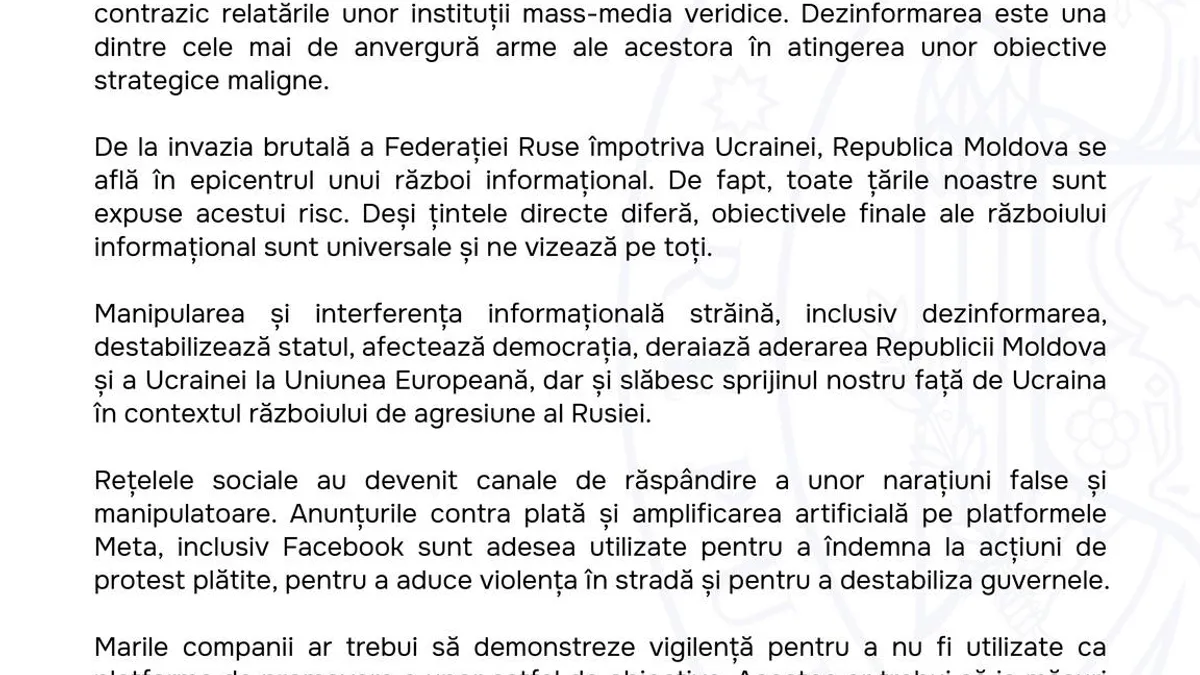 „Platformele tehnologice au devenit câmpuri de luptă virtuale, iar puterile străine ostile le folosesc pentru a răspândi narațiuni false care contrazic relatările bazate pe fapte. Anunțurile plătite pe platformele Meta, inclusiv Facebook, sunt adesea folosite pentru a îndemna la tulburări sociale cu scopul de a destabiliza guvernele”, se arată în scrisoare.