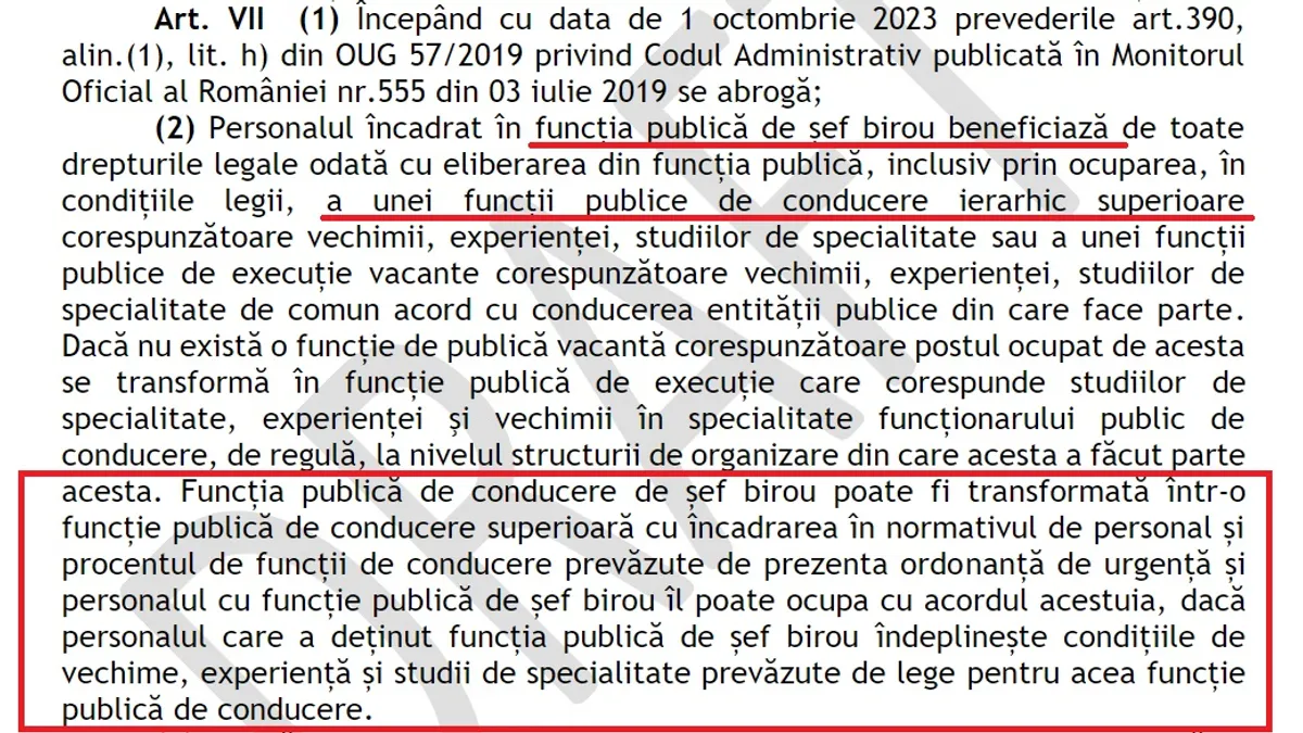 Astfel, la articolul VII (2), se menționează că "personalul încadrat în funcția publică de șef birou beneficiază de toate drepturile legale odată cu eliberarea din funcția publică, inclusiv prin ocuparea, în condițiile legii, a unei funcții publice de conducere ierarhic superioare corespunzătoare vechimii, experienței, studiilor de specialitate sau a unei funcții publice de execuție vacante corespunzătoare vechimii, experienței, studiilor de specialitate de comun acord cu conducerea entității publice din care face parte".