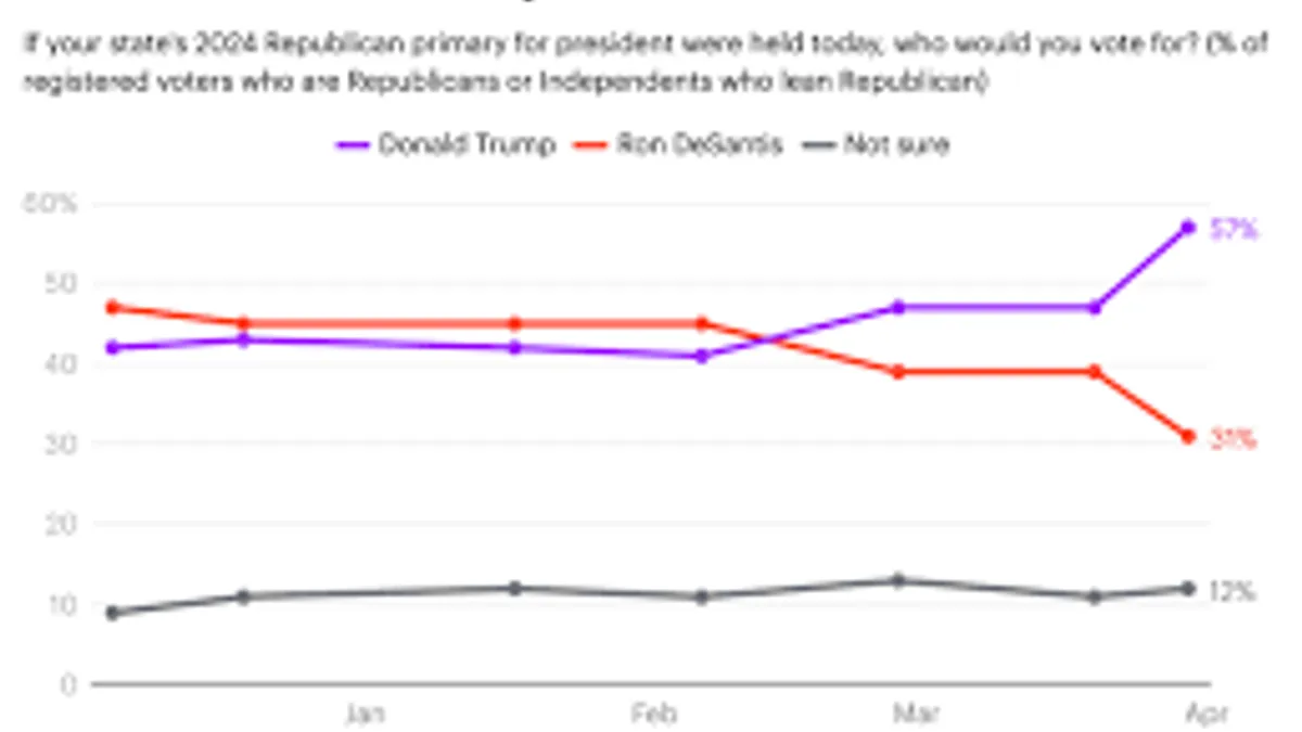 Candidatura fostului președinte este susținută de 57% dintre alegătorii republicani, în timp ce DeSantis este sprijinit de doar 31%, în cazul unei competiții directe între cei doi. Acum două săptămâni, Trump avea un avans de doar opt procente în fața lui DeSantis.