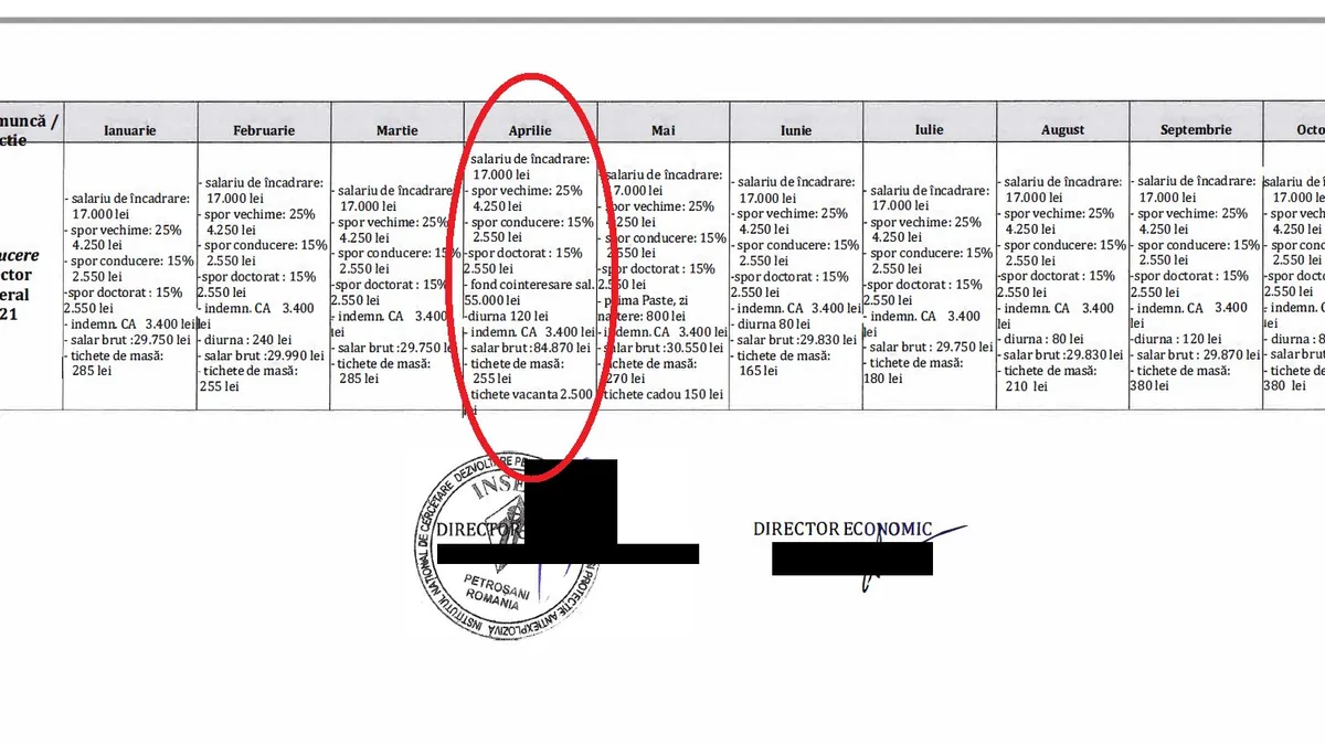 Pe lângă salariul «normal» de 17.000 lei/lună, mai ia spor de vechime 4.250 lei/lună, spor de conducere 2.550 lei/lună, spor de doctorat alți 2.550 lei/lună, indemnizație de consiliu 3.400 lei/lună, diurnă, tichete de masă și tichete cadou.