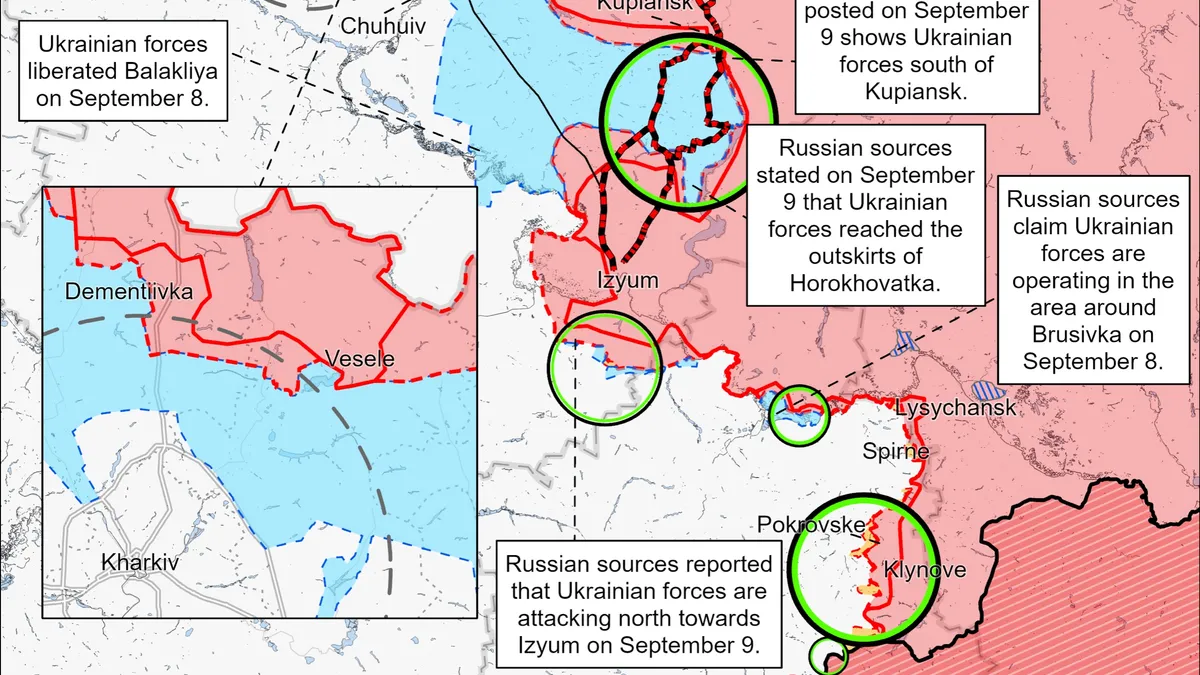Probleme pentru Ucraina: rușii se retrag mai repede decât pot forțele sale să avanseze și nu poate gestiona fluxul mare de prizonieri de război, arată mai mulți oficiali de la Kiev. Avansul forțelor Kievului a fost recunoscut și la televiziunile ruse, care au încercat să minimalizeze importanța orașelor pierdute și au susținut că forțele lor se retrag „în mod ordonat”.