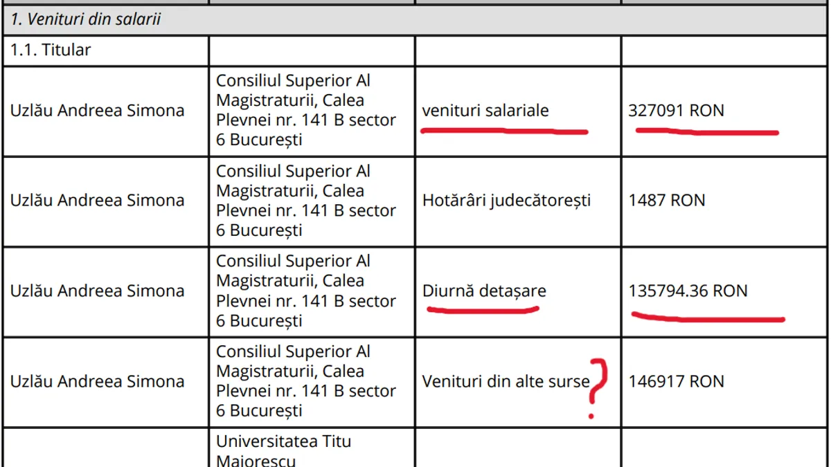 De exemplu, secretarul general al CSM, Andreea Simona Uzlău, a încasat în anul fiscal 2023 diurne de detașare în valoare de ușor peste 135.000 de lei. Ea are un salariu net anual de 327.000 de lei, pe lângă care CSM i-a mai plătit „venituri din alte surse” de 146.917 lei. Soțul ei lucrează la Inspecția Judiciară, unde a obținut un salariu de 203.000 lei în 2023, net. Însă acesta nu este un caz singular.