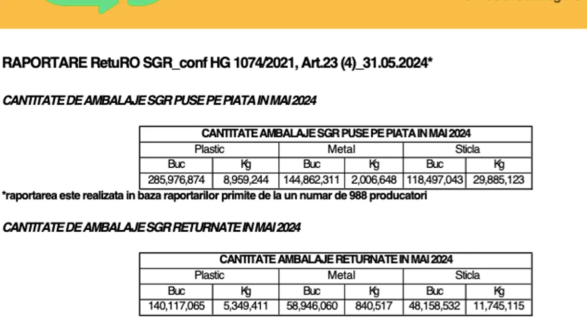 De unde știm: în luna mai a.c., producătorii au pus pe piață 549 de milioane de ambalaje, din care au fost predate spre reciclare doar 247 de milioane de ambalaje.