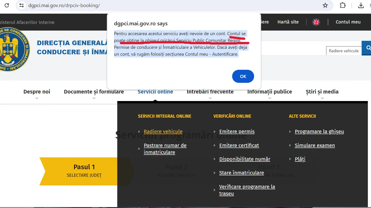 În plus, pe site se arată că: „Pentru accesarea acestui serviciu aveți nevoie de un cont. Contul se poate obține la ghișeul oricărui Serviciu Public Comunitar Regim Permise de conducere și Înmatriculare a Vehiculelor. Dacă aveți deja un cont, vă rugăm folosiți secțiunea Contul meu - Autentificare”.
