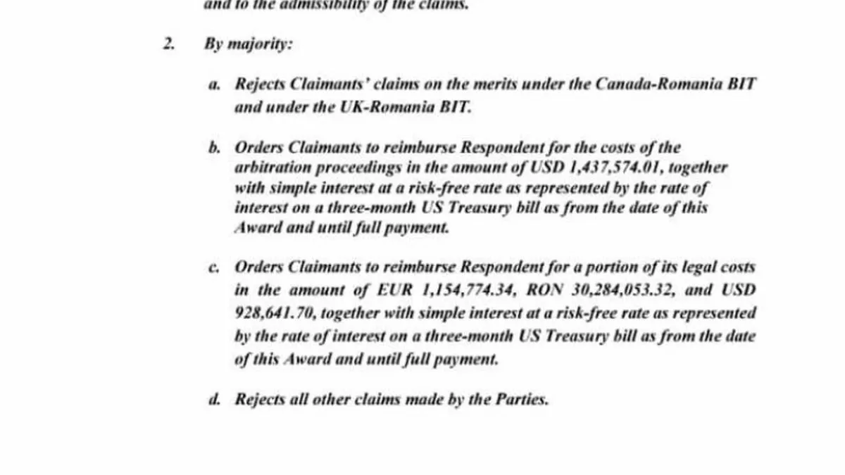 b. Obligă reclamanții să ramburseze pârâtului costurile procedurilor de arbitraj în valoare de 1.437.574,01 USD, împreună cu o dobândă simplă la o rată fără risc, reprezentată de rata dobânzii la un bon de trezorerie al SUA pe trei luni, de la data prezentei hotărâri și până la plata integrală.