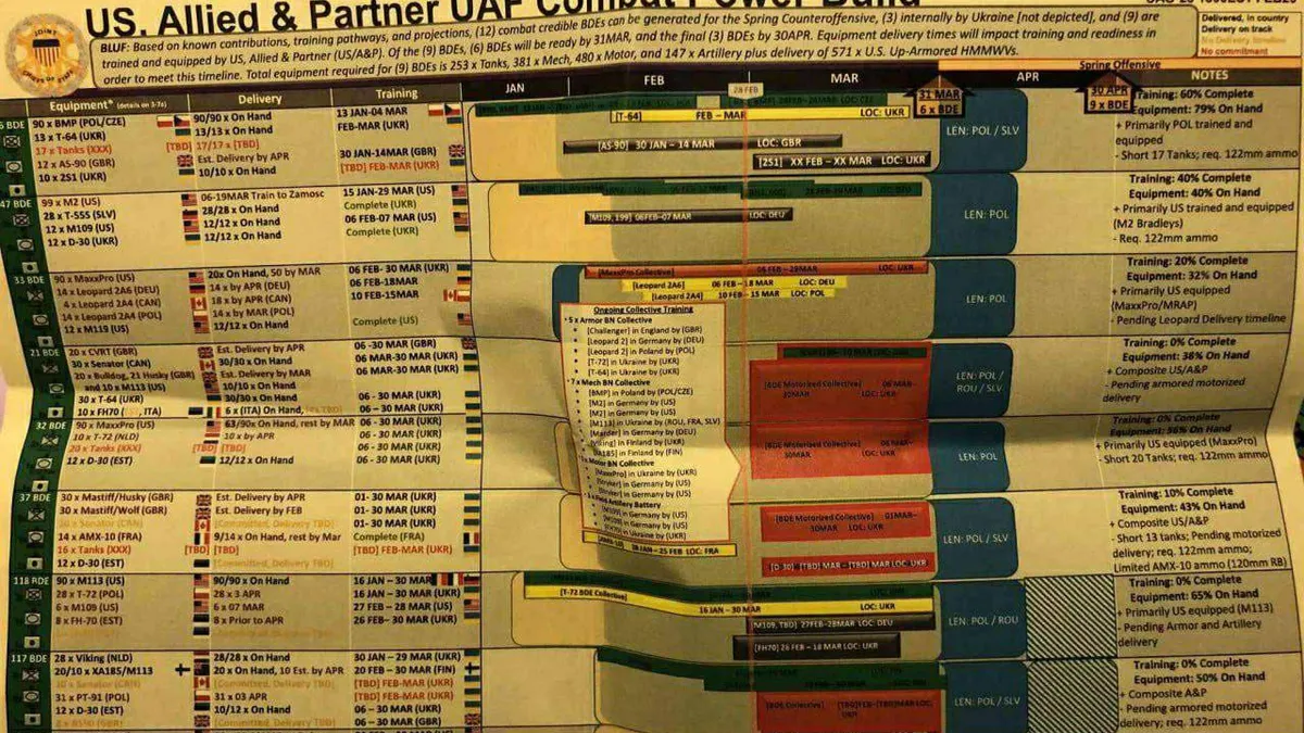 Un alt document enumeră unitățile ucrainene, echipamentele și antrenamentul acestora. Documentul conține un rezumat al celor 12 brigăzi de luptă care sunt în curs de mobilizare, nouă dintre ele fiind aparent antrenate și aprovizionate de Statele Unite și de alți aliați NATO. Dintre aceste nouă brigăzi, documentele spun că șase vor fi gata până la 31 martie, iar restul până la 30 aprilie. O brigadă ucraineană are între 4.000 și 5.000 de soldați, au declarat analiștii.