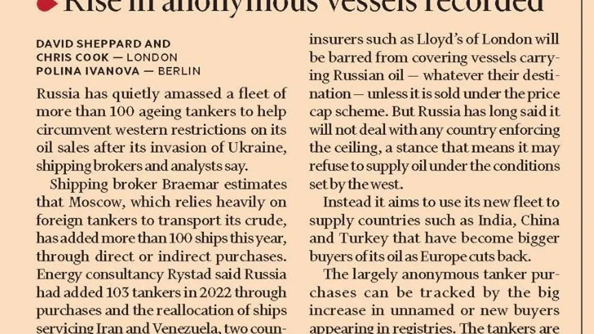 Russia has quietly amassed a fleet of over 100 ageing tankers to help circumvent western restrictions on Russian oil sales following its invasion of Ukraine — by @OilSheppard @xtophercook https://t.co/EAUZ3k08Mc