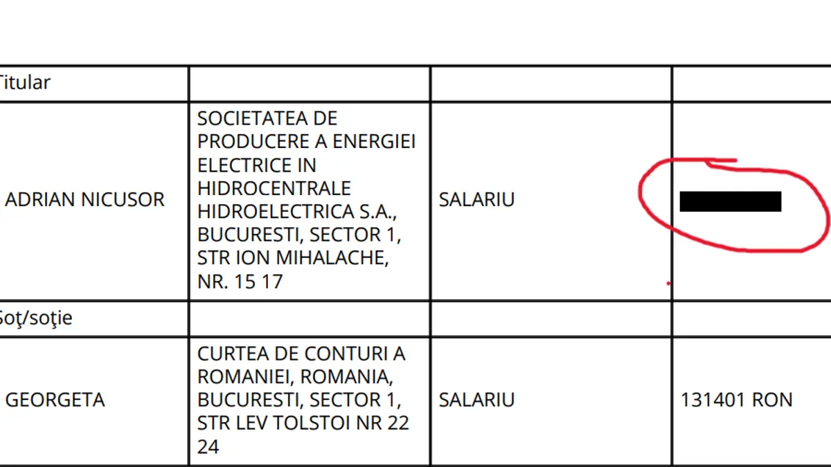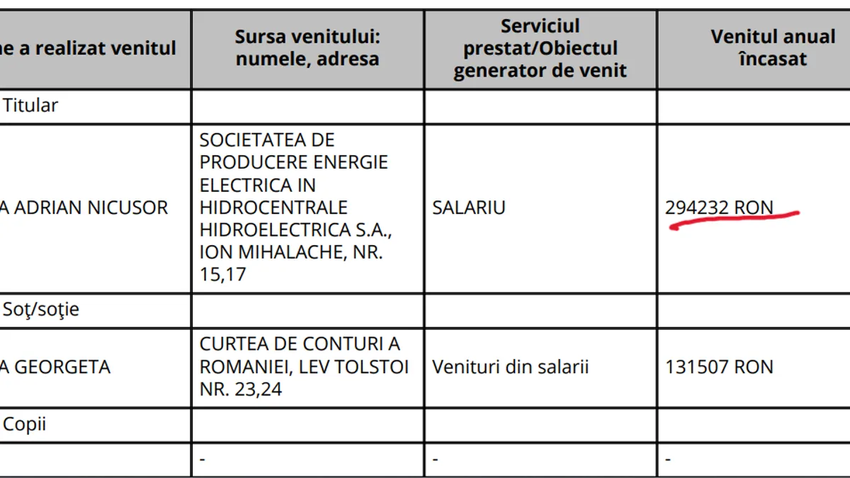 La rubrica „Venituri ale declarantului şi ale membrilor săi de familie, realizate în ultimul an fiscal încheiat”, acesta trece o bandă neagră peste salariul său de la Hidroelectrica. Soția sa lucrează la Curtea de Conturi, unde, în anul fiscal 2022, a câștigat 131.401 lei.