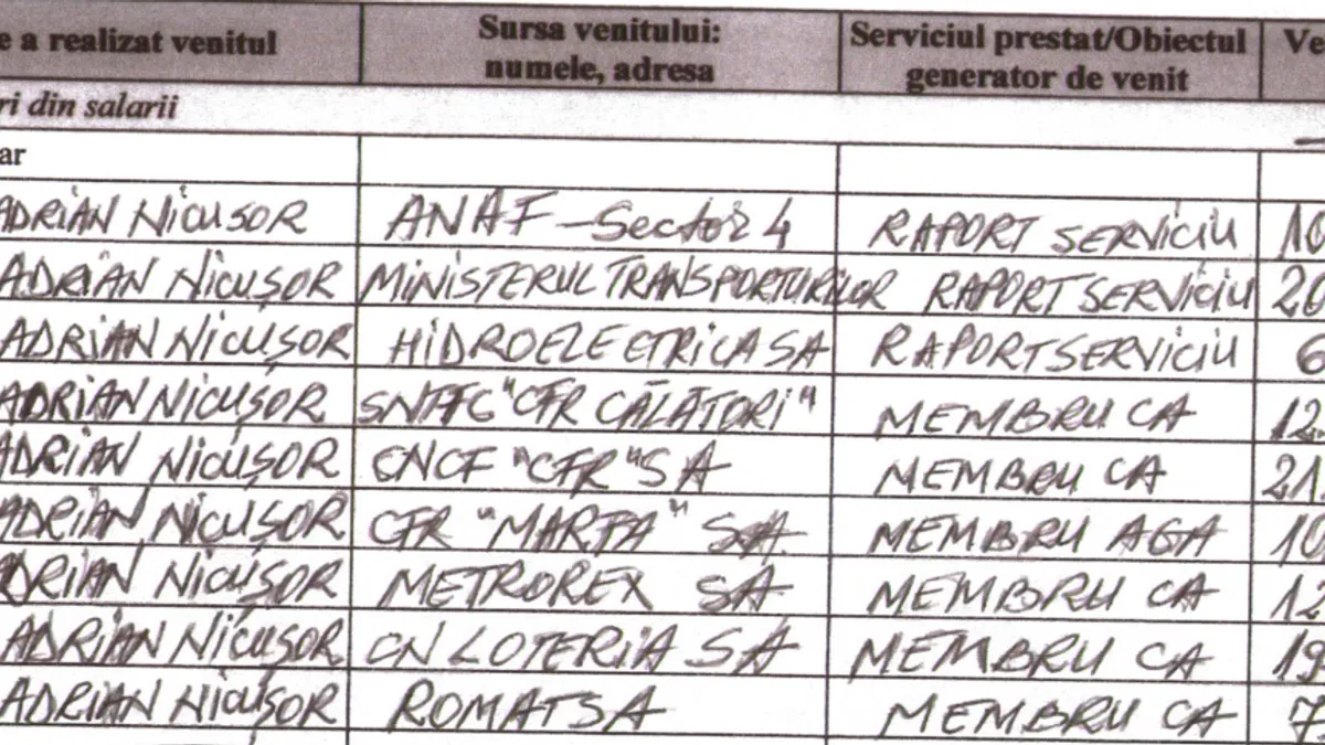 Însă, o rubrică mai sus, în declarația de avere, unde se consemnează „Cadouri, servicii sau avantaje primite gratuit sau subvenţionate faţă de valoarea de piaţă”, apar salariile soților Nica, de la Hidroelectrica și Curtea de Conturi, probabil din greșeală.