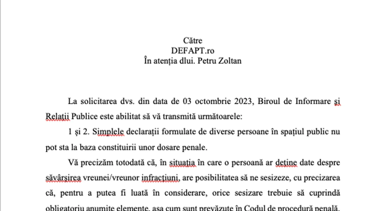 La solicitarea DeFapt.ro, DNA a transmis că „simplele declarații formulate de diverse persoane în spațiul public nu pot sta la baza constituirii unor dosare penale”.