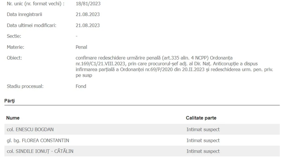 De la începerea anchetei au trecut aproape trei ani, timp în care ancheta DNA a stagnat. De pe site-ul Curții Militare de Apel București aflăm că procurorii militari au cerut „confimare redeschidere urmărire penală (art. 335 alin. 4 NCPP) Ordonanţa nr. 169/C1/21.VIII.2023, prin care procurorul-şef adj. al Dir. Naţ. Anticorupţie a dispus infirmarea parţială a Ordonanţei nr. 69/P/2020 din 20.II.2023 şi redeschiderea urm. pen. priv. pe susp”.