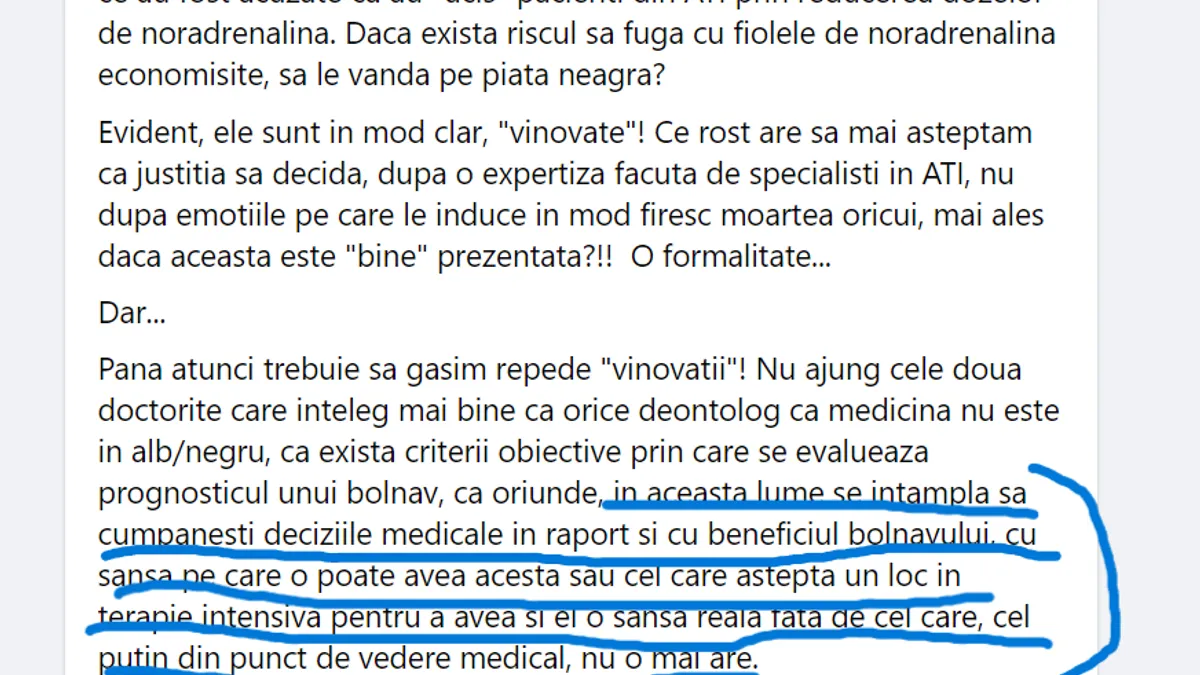 Nu ajung cele două doctorițe care înțeleg mai bine că orice deontolog că medicina nu este în alb/negru, că există criterii obiective prin care se evaluează prognosticul unui bolnav, că oriunde, în această lume se întâmplă să cumpănești deciziile medicale în raport și cu beneficiul bolnavului, cu șansa pe care o poate avea acesta sau cel care aștepta un loc în terapie intensivă pentru a avea și el o șansă reală față de cel care, cel puțin din punct de vedere medical, nu o mai are.