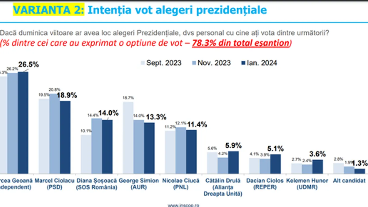 „În varianta de candidaţi testată inclusiv în septembrie şi noiembrie 2023, dacă duminica viitoare ar fi chemaţi să voteze noul preşedinte al României, din cei 78,3% dintre români care au o opţiune de vot, 26,5% l-ar alege pe Mircea Geoană, candidat independent, (25,3% în septembrie şi 26,2% în noiembrie 2023), 18,9% ar pune ştampila pe Marcel Ciolacu, candidat din partea PSD (19,5% în septembrie şi 20,8% în noiembrie 2023) şi 14% pe Diana Şoşoacă, din partea SOS România (10,1% în septembrie şi 14,4% în noiembrie 2023).