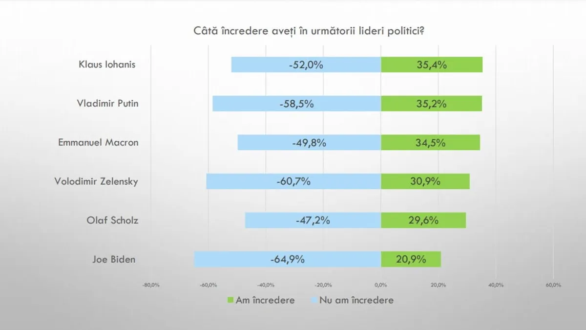 În ceea ce privește încrederea în liderii politici străni, Klaus Iohannis este pe primul loc. Însă, cu o cotă de încredere de 35,2%, Vladimir Putin este la doar 0,2% în urma președintelui României - practic, diferența este în marja de eroare. În Volodimir Zelenski au încredere 30,9% din cei chestionați.