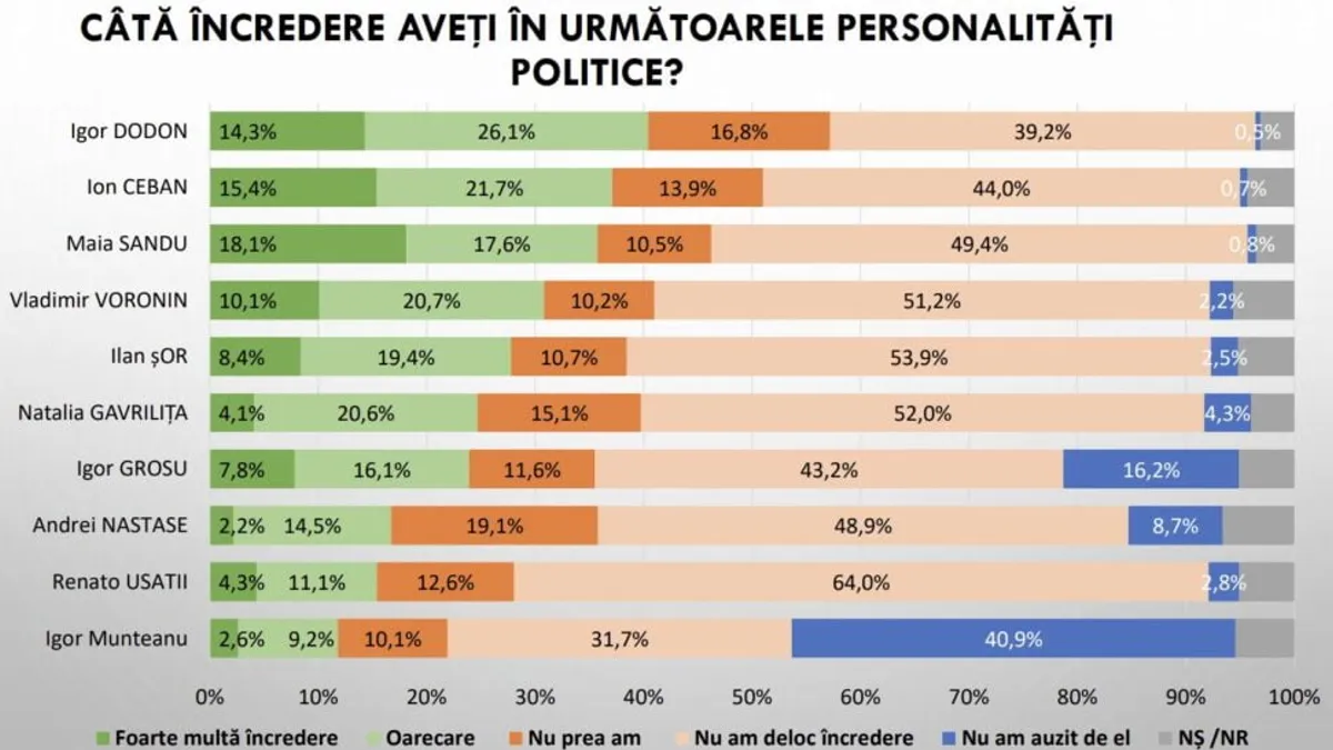 Potrivit sondajului, cetățenii din R.Moldova au cea mai mare încredere în Igor Dodon și Ion Ceban, actuala președintă Maia Sandu situându-se pe locul trei. Totuși, PAS, partidul Maiei Sandu, ar ieși pe primul loc la parlamentare, cu 23%, urmat de PSRM și Partidul Șor.
