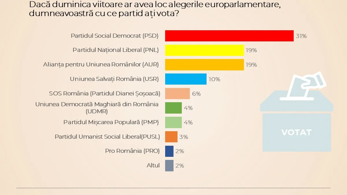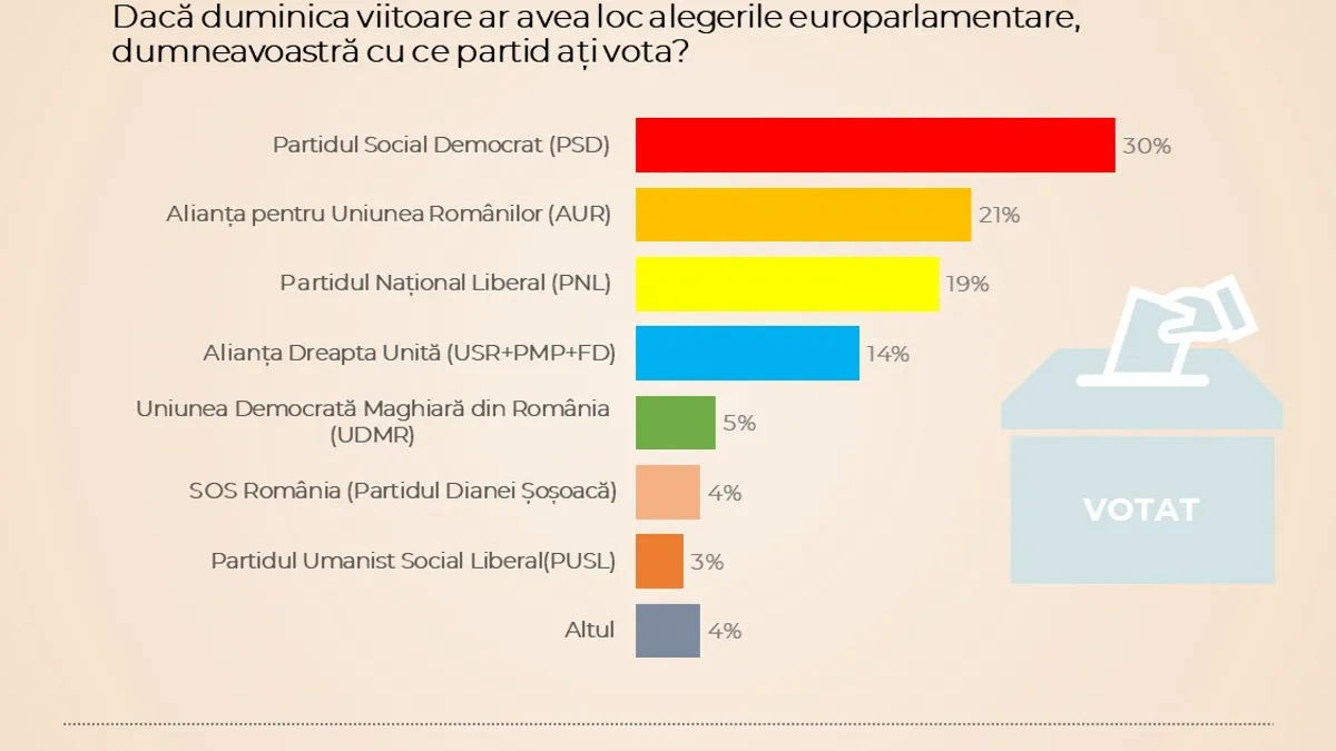 În sondaj este măsurată și intenția de vot la europarlamentare, care arată că PSD se menține la 30% (31% în septembrie și noiembrie 2023, dar diferența este în marja de eroare), în timp ce PNL a rămas la 19% (la fel ca în septembrie și noiembrie 2023).