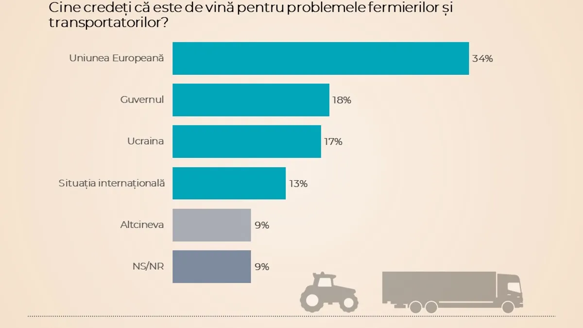 Un semnal foarte prost către UE este faptul că 34% dintre cei chestionați consideră că Bruxelles-ul este vinovat pentru problemele fermierilor și transportatorilor. Doar 18% dau vina pe Guvern și 17% pe Ucraina.