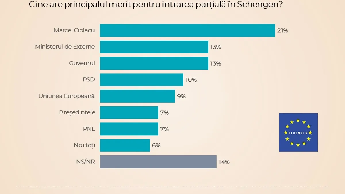 Însă meritele acestui succes parțial sunt atribuite lui Marcel Ciolacu - 21%, ministerului de Externe - 13%, Guvernului - 13% și 10% - PSD. Doar 7% cred că a fost meritul PNL. Pe lista de opțiuni nu figurează însă ministerul de Interne, deși acordul politic cu Austria și Bulgaria a fost semnat de ministrul Cătălin Predoiu.
