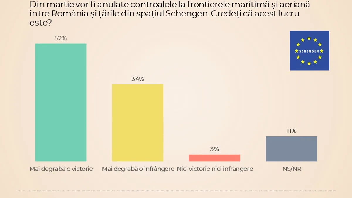 Pe de altă parte, 52% dintre cei chestionați cred că primirea parțială în spațiul Schengen a fost un lucru mai degrabă bun, in timp ce 34% o consideră a fi mai degrabă o înfrângere.