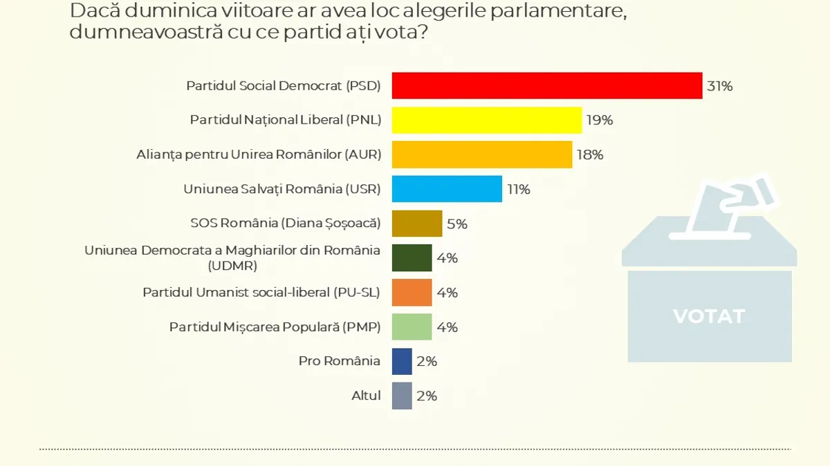 Partidul Dianei Șoșoacă, SOS România, care crescuse peste pragul electoral încă din septembrie, în detrimentul AUR, este acum la 4%, însă se află în marja de eroare. Astfel de situații pot genera însă o dezertare a alegătorilor care ar putea da un vot util, pentru un partid apropiat ca program și care are șanse mai mari să treacă de pragul de 5%.