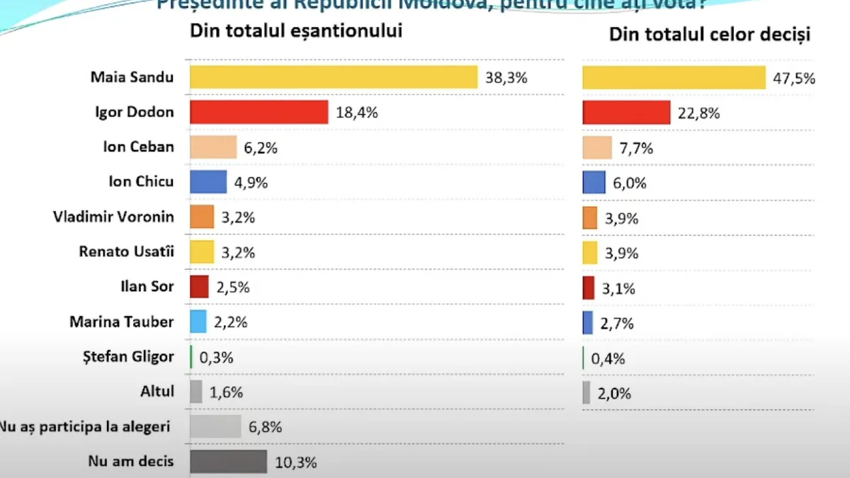 Dacă se iau în considerare doar cei deciși să voteze, pe primul loc ar ieși Maia Sandu – cu 47,5%, urmată de Igor Dodon – cu 22,8%.