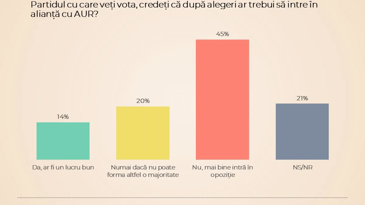 Sondajul CURS arată că 45% dintre alegători nu ar fi de acord cu o alianță cu AUR, 14% spun că ar fi un lucru bun și 20% ar agrea o astfel de combinație politică „numai dacă nu poate crea altfel o majoritate”.
