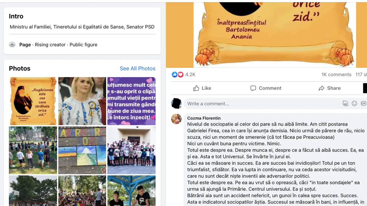 Totul despre Firea, bătrânii - un accident. Un comentariu la cea mai recentă postare a Gabrielei Firea se va lăsa cu sancțiuni la adresa echipei de social media a fostei ministre.