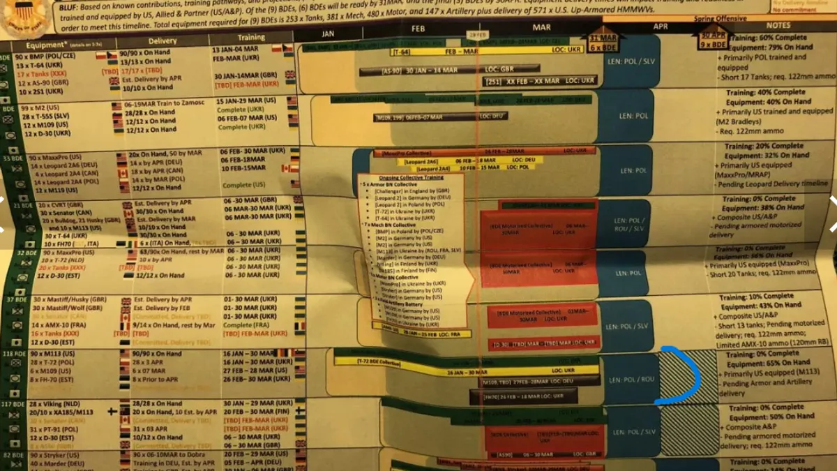 Deși liniile generale (și chiar specificul) livrărilor străine către Ucraina sunt cunoscute public, documentul indică măsura în care livrările culminează cu o "ofensivă de primăvară" care este planificată pentru 30 aprilie 2023.