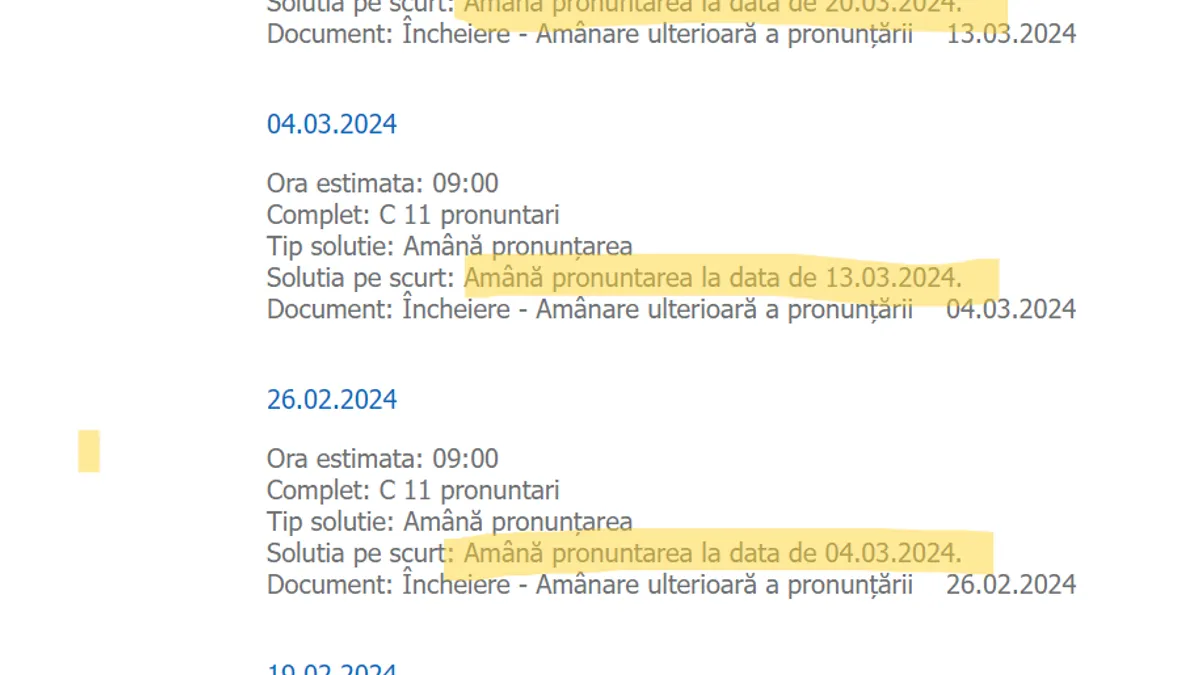 O nouă ședință de judecată în dosarul 4395/740/2021 este prevăzută pentru 20 martie. Dar doar în 2024 au fost nu mai puțin de nouă amânări, prima la 3 ianuarie și ultima la 13 martie.