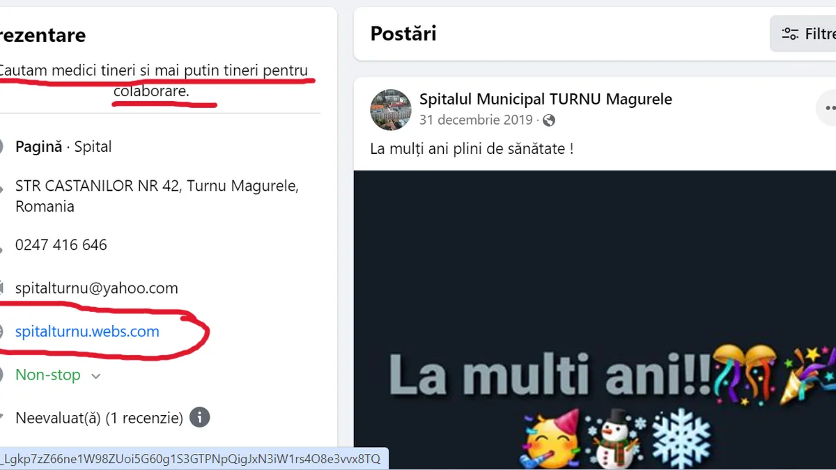 Spitalul din Turnu Măgurele nu are un site funcțional, ci doar o pagină de Facebook. pe această pagină este indicată adresa unui site, însă acesta este nefuncțional.