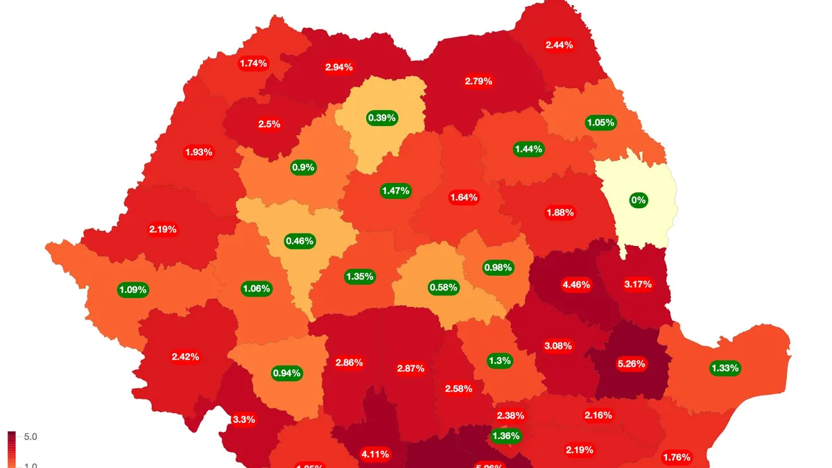 La polul opus, prietenii noștrii: Brăila (5.26%) la egalitate cu Giurgiu (5.26%) și Teleorman (5.17%).