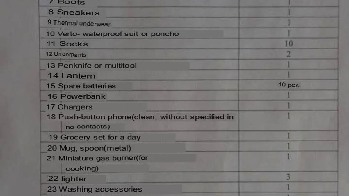 Pe rețelele sociale circulă și liste lungi cu echipamentele pe care trebuie să le cumpere recruții, inclusiv căști și cuțit. Pe listă se mai află: baterii, izmene, mâncare pentru o zi, cană și lingură de metal sau rucsac de 60 de litri.