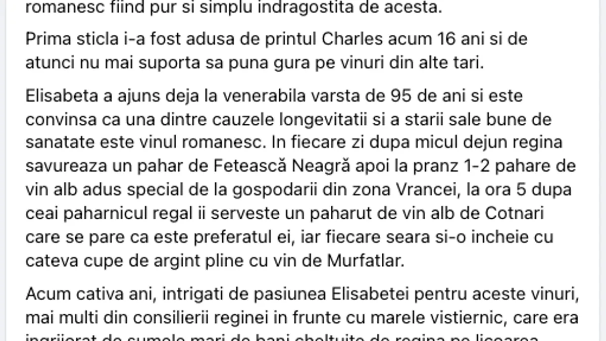 Citește și: Penelista Vijulie, delir pe Facebook: Regina Marii Britanii bea zilnic cinci-șase pahare de vin românesc