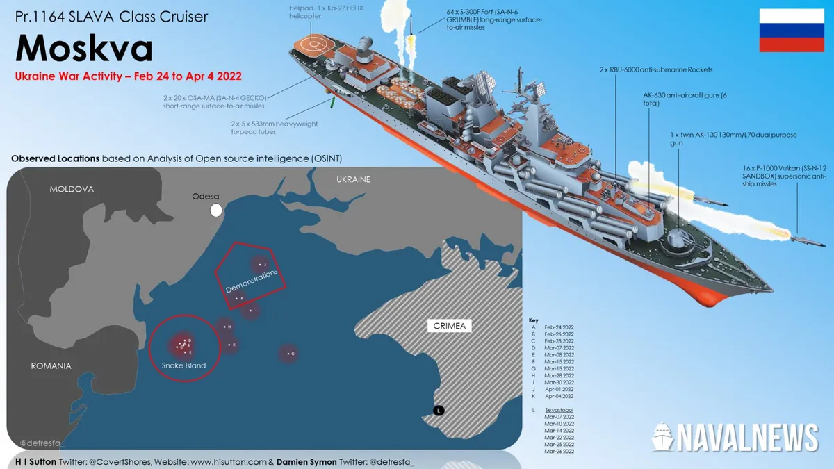 „Crucișătorul Moscova și aproape toate navele de război rusești s-au întors periodic în portul lor de origine, Sevastopol, în Crimeea. Interesant, nava a acostat în poziția ei obișnuită, creând un model previzibil de mișcări. Acesta poate fi un indicator al modului în care Sevastopolul este văzut, ca fiind ferit de atacuri. Este adevărat că se află în afara raza de acțiune a rachetelor ucrainene și este protejat de apărări antiaeriene stratificate. Însă, la 26 martie, a avut loc un incident, când rachete S-400 au fost lansate asupra orașului. Acest incident nu pare să fi schimbat modul de operare al navei Moscova”, scria, în aprilie, Naval News.