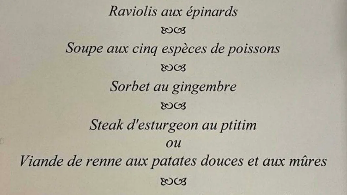 Potrivit meniului, cina a început cu cartofi înăbușiți cu languste. La felul doi s-au servit ravioli cu spanac. A urmat o supă cu nu mai puțin de cinci specii de pește, sorbetul de ghimbir urmat de o friptură de sturion sau carne de ren, cu cartofi dulci și mure. La desert: tartă de pere cu înghețată de vanilie.