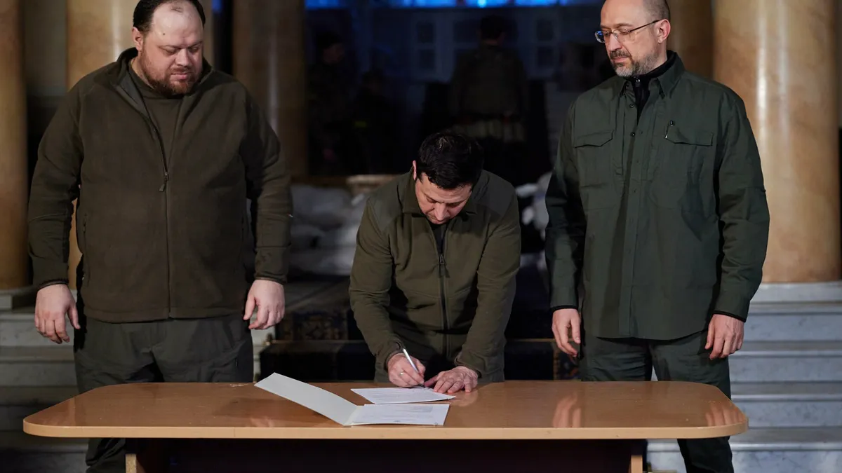 FOTO Îmbrăcat în bluză verde, militară, Zelenski a semnat cererea de aderare la UE