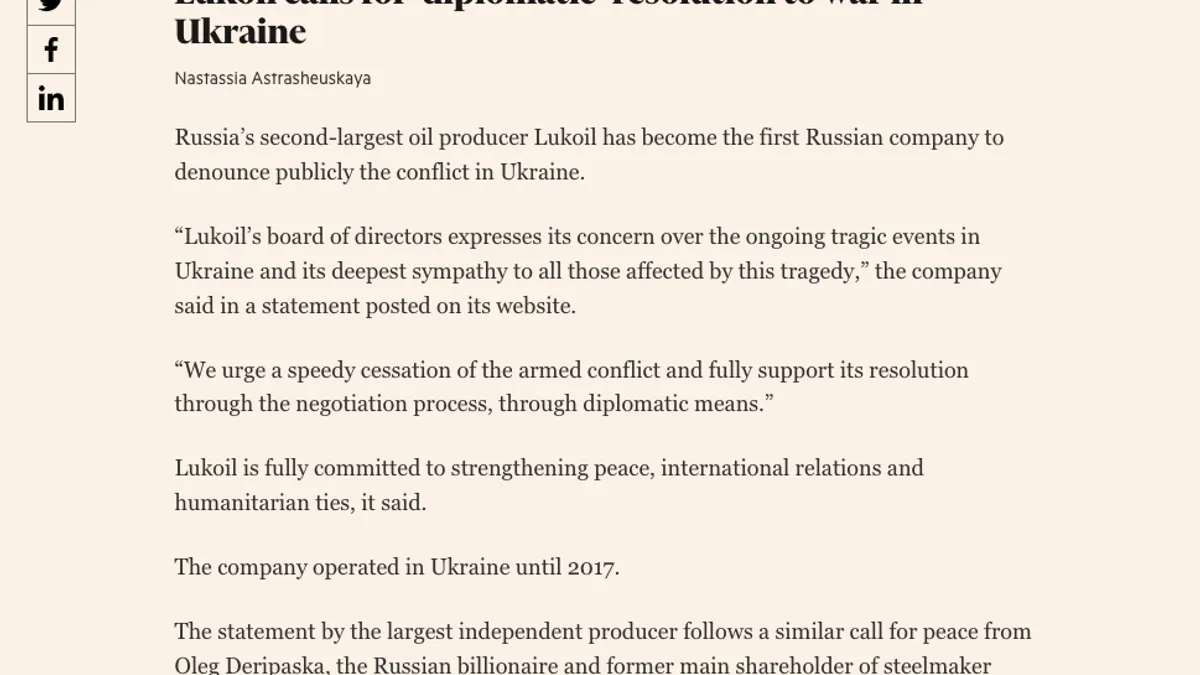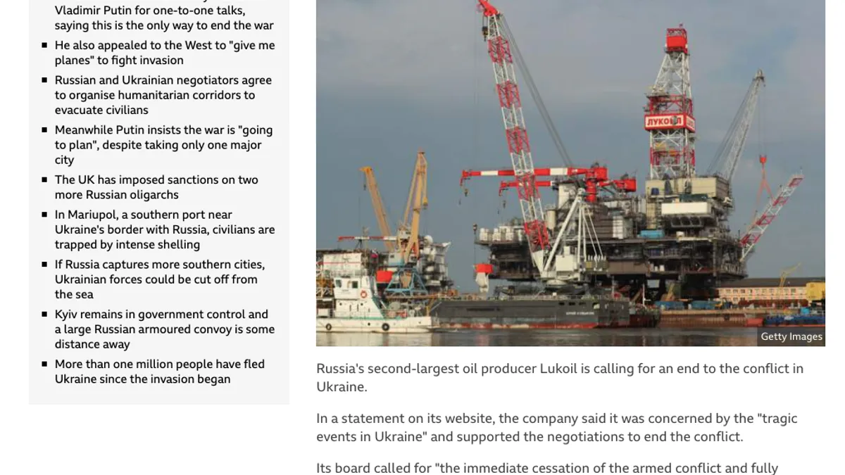 Lukoil.com, sabotat după criticarea invaziei. Lukoil a cerut, joi seara, oprirea imediată a războiului din Ucraina. Este prima mare companie rusească care pare a acționa împotriva direcției date de Kremlin.