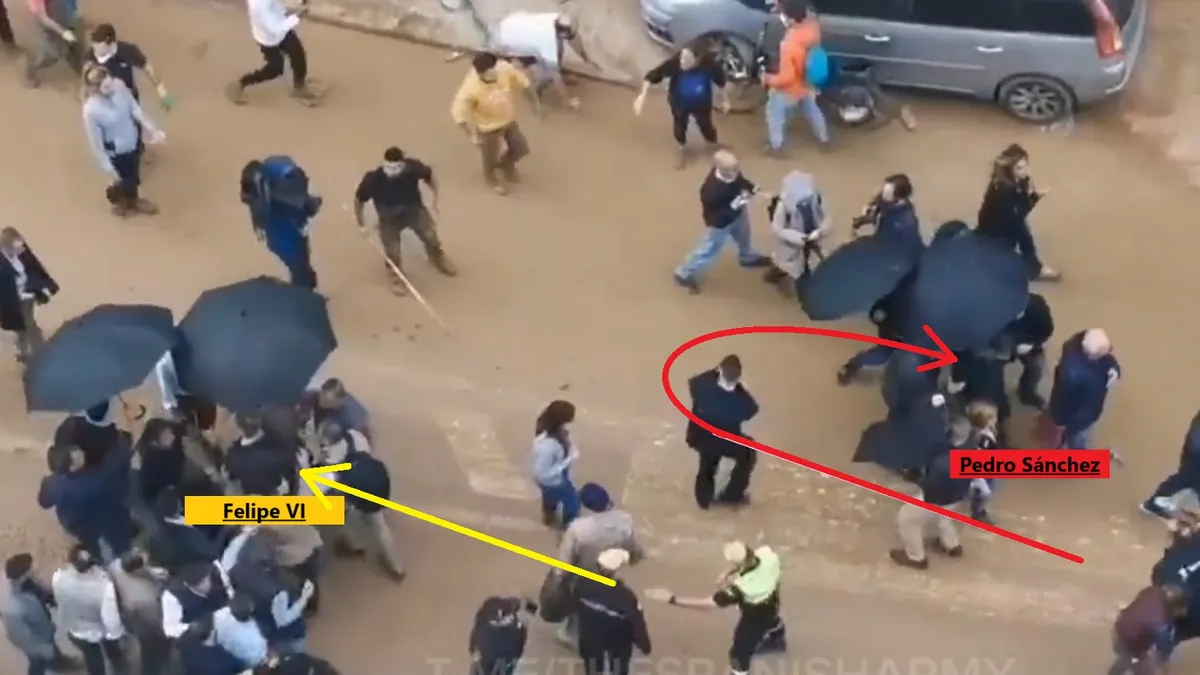 O filmare virală pe rețelele sociale îl arată pe regele Spaniei, Felipe al VI-lea, cum dă deoparte umbrela care-l proteja de protestatari și se duce să discute cu sinistrații furioși.