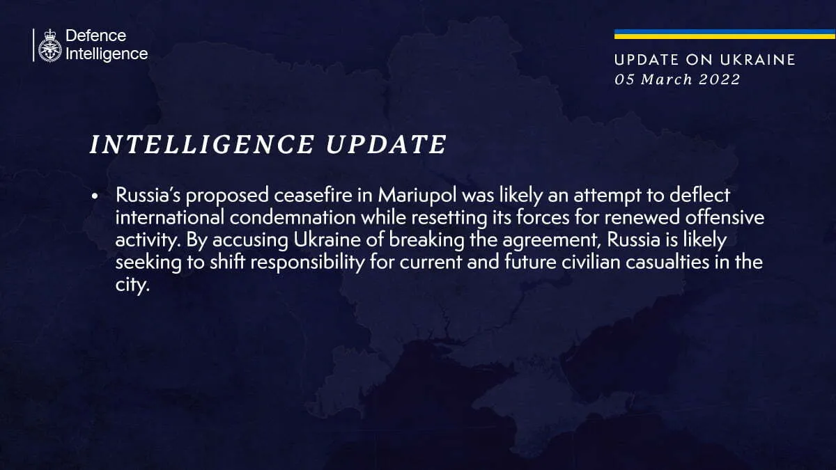 „Propunerea rusă de întrerupere a focului la Mariupol a fost probabil mai degrabă o tentativă de a respinge acuzațiile internaționale, în timp ce forțele se regrupau pentru o nouă ofensivă. Acuzând Ucraina că a rupt acordul, Rusia se pregătește să paseze responsabilitatea pentru actualele și viitoarele pierderi de vieți din rândul civililor în acest oraș”, se arată în postarea oficialilor britanici.
