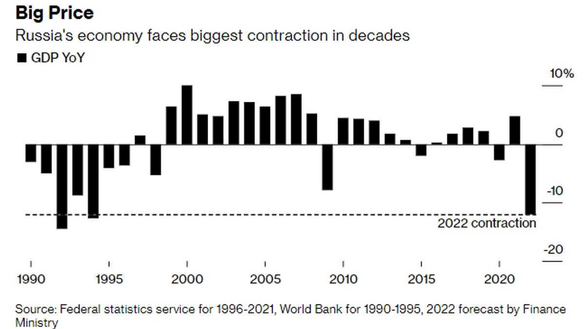Bloomberg prezintă un grafic care arată că o contracție de 12% a economiei rusești nu s-a mai produs din 1994.