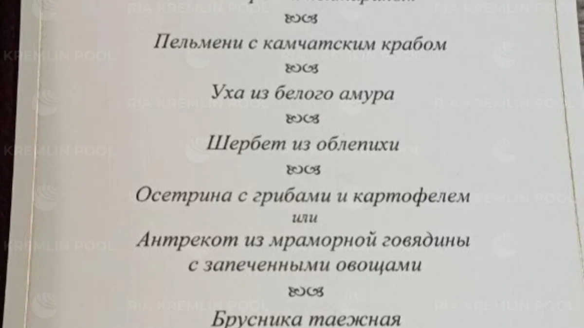Lui Putin și Kim li se oferă un meniu care începe cu o salată de rață, smochine și nectarine, urmată de găluște rusești "pelmeni" făcute cu crab de Kamchatka - apoi o supă de pește alb Amur și