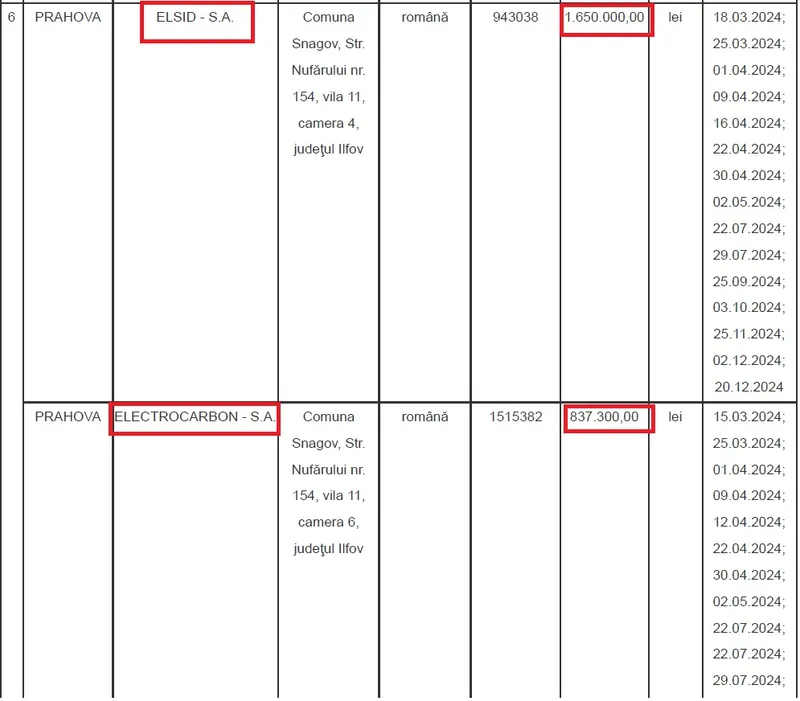 Cealaltă firmă, Electrocarbon, a donat suma de 837.300 lei, tot în 15 tranșe, dar în perioada 15 martie – 25 noiembrie 2024.