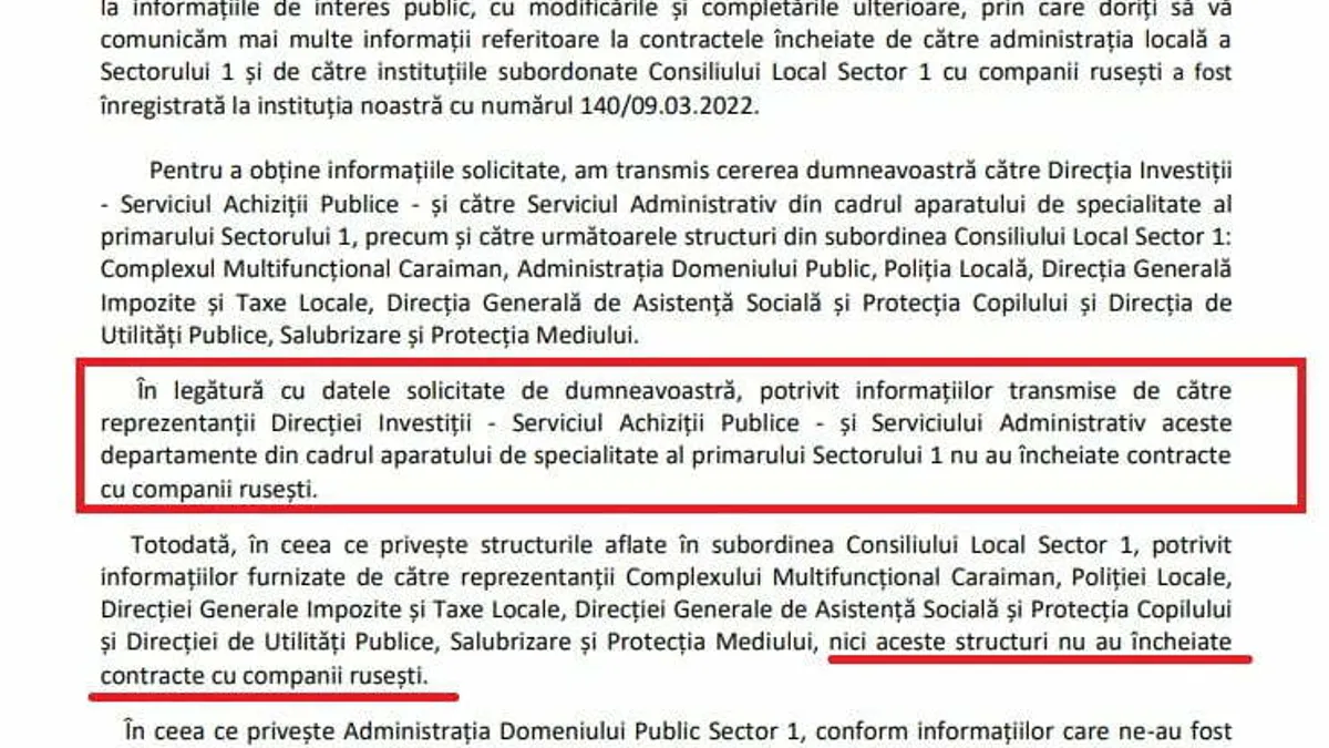 "În legătură cu datele solicitate de dumneavoastră, potrivit informațiilor transmise de către reprezentanții Direcției Investiții - Serviciul Achiziții Publice - și Serviciului Administrativ aceste departamente din cadrul aparatului de specialitate al primarului Sectorului 1 nu au încheiate contracte cu companii rusești.