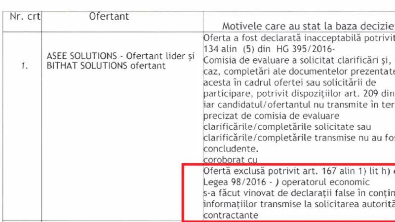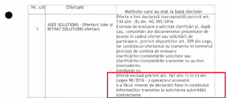 „Oferta exclusă potrivit art. 167 atin 1) lit h) din Legea 98/2016 - operatorul economic s-a făcut vinovat de dectarații false în conținutul informațiilor transmise la solicitarea autorității contractante”, se menționează în raportul Comisiei de licitație.