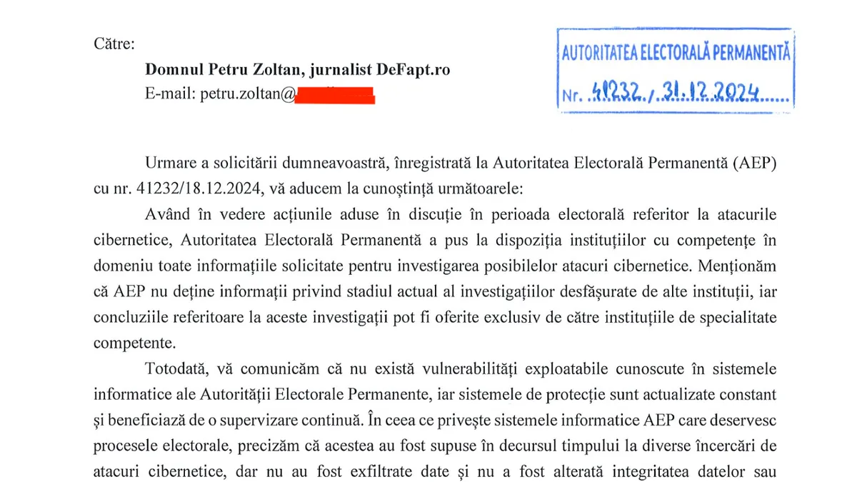 DeFapt.ro a solicitat SRI, AEP și STS să comunice dacă investigațiile comune au fost finalizate, respectiv care au fost concluziile acestora, dar și dacă rezultatul final al alegerilor prezidențiale a fost viciat în urma atacurilor cibernetice.
