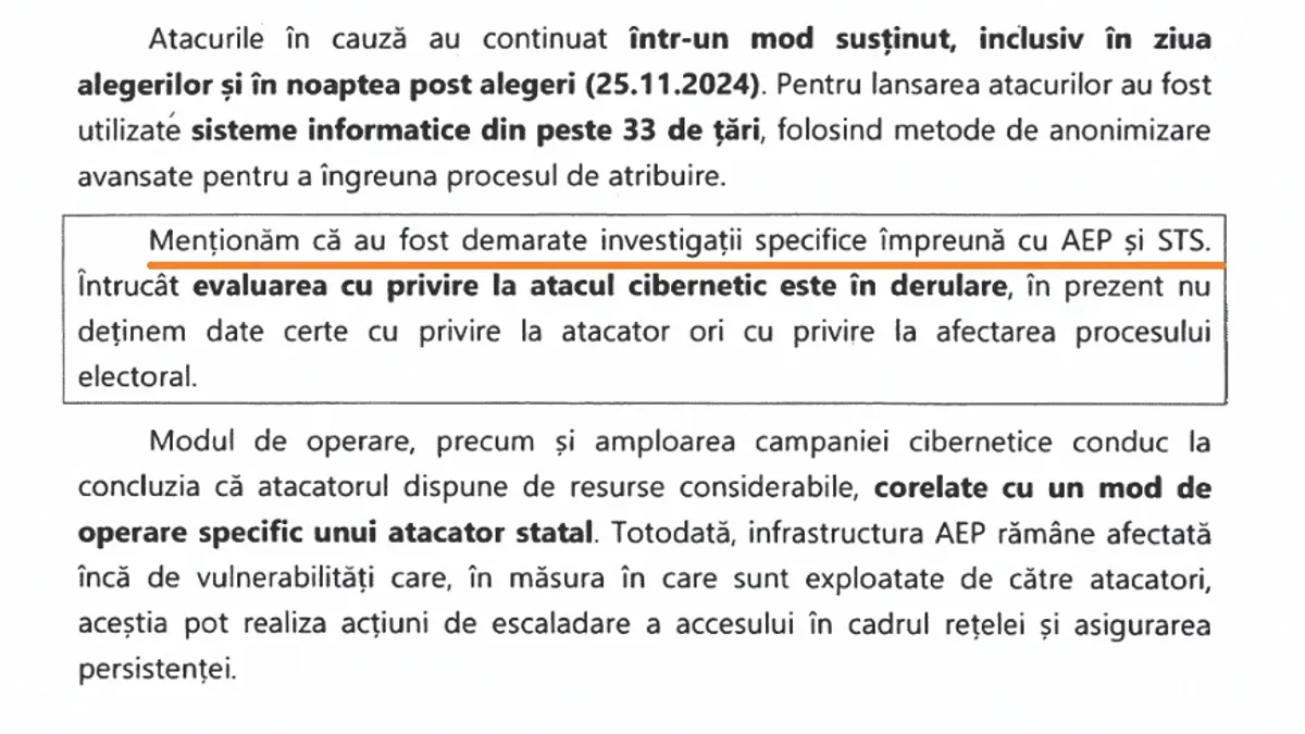"În context, a fost identificat un număr ridicat de atacuri cibernetice (peste 85.000), care au vizat exploatarea vulnerabilităților existente la nivelul sistemelor informatice de suport pentru procesul electoral, în vederea obținerii accesului la date din sistemele informatice, alterării integrității acestora, schimbării conținutului prezentat publicului larg și indisponibilizării infrastructurii", se menționa în documentul SRI.