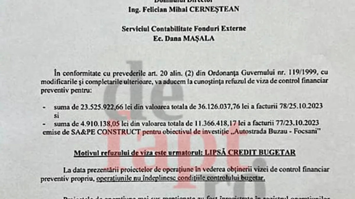 "În conformitate cu prevederile art. 20 alin. (2) din Ordonanța Guvernului nr.119/1999, cu modificările și completările ulterioare, vă aducem la cunoștință refuzul de viză de control financiar preventiv pentru: suma de 23.525.992,66 lei din valoarea totală de 36.126.037,76 lei a facturii 78/25.10.2023 și suma de 4.910.138,05 lei din valoarea totală de 11.366.418,17 lei a facturii 77/23.10.2023 emise de SA&PE Construct pentru obiectivul de investiții Autostrada Buzău – Focșani.